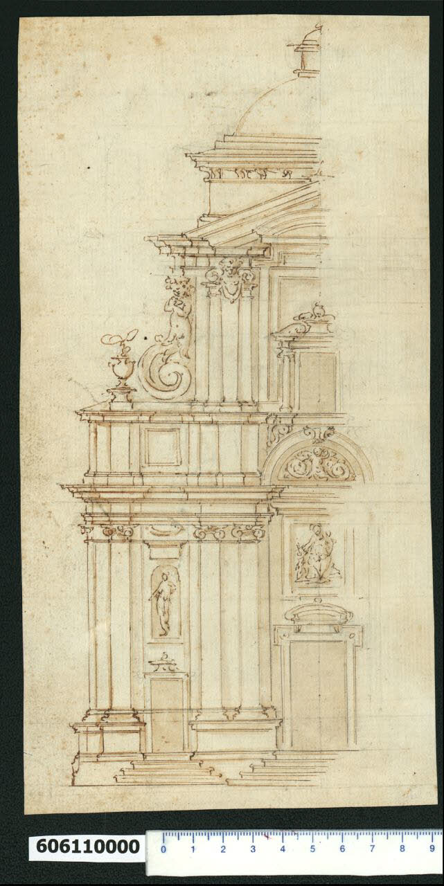 - NOTIZIE STORICO CRITICHE Nell'"Indice de due Tomi d'Intagli Tempietti ed altro", relativo ai tomi V e VI e compilato dal collezionista Giacomo Sardini, il disegno viene iscritto nel paragrafo "Chiese e loro parti" con la definizione "141 Facciata di Chiesa".\nLa chiesa la cui facciata è raffigurata parzialmente sul foglio, come accade in molti disegni della Collezione Sardini Martinelli in caso di simmetria della composizione, non è identificabile e potrebbe trattarsi di un progetto non realizzato attribuibile però per analogia stilistica a Giovanni Battista Montano.\nIl disegno, è attribuito a Montano anche da V. Pracchi su segnalazione di A. Bedon (Pracchi, 1991 p. 19) e indicato da L. Fairbairn (Fairbairn, 1998 vol. II, Appendix 8, p. 770).\nIl piano della chiesa è sopraelevato e all'ingresso centrale più ampio e a quello laterale minore si accede tramite distinte scalinate allargate e avanzate rispetto alla zoccolatura. \nLa composizione della facciata si sviluppa in una campata su due livelli che corrisponde alla navata centrale e una campata laterale che si arresta al primo livello, sovrastata da una fascia ed elementi decorativi di raccordo al piano superiore: una cariatide in forma di mezzo angelo su voluta vegetale, che sostiene il cornicione laterale e un'urna fumante esterna.\nLe campate del livello inferiore sono individuate da ordini di paraste (o semicolonne) ioniche, binate e su medesimo basamento nella parte centrale e singola all'esterno, ma probabilmente riproposta sul fianco della chiesa. \nL'ingresso centrale è contornato da una cornice sagomata dagli spigoli sorgenti e sovrastata da un frontone curvilineo con volute laterali. Sopra questo si trova una riquadratura in cui è rappresentato Cristo in groppa all'asina. \nL'ingresso della campata laterale ha un contorno semplice con un elemento decorativo superiore sagomato; sopra d esso è una nicchia semicircolare con una statua, protetta al di sopra da un tratto di cornice sporgente dalla muratura.\nLe paraste sorreggono un cornicione sporgente, che si arresta in corrispondenza della riquadratura centrale, sopra il quale è impostata la fascia in muratura superiore articolata. Allo stesso livello sopra la riquadratura centrale, si trova la lunetta contornata da un arco e decorata con un mezzo angelo su volute vegetali. \nAl secondo livello, sopra la lunetta, si apre una finestra a edicola, inserita in una riquadratura con doppia cornice sagomata e sovrastata da un frontone curvilineo che interrompe alla base il frontone triangolare terminale. Quest'ultimo è sorretto dalla struttura, corrispondente alle paraste binate del primo livello, costituita da un sostegno centrale che termina con un mezzo busto di angelo le cui ali in forma di voluta poggiano su due paraste laterali più basse. \nDalla composizione della facciata emerge la cupola retrostante impostata su un breve tamburo al quale la calotta gradonata alla base e completata da lanternino, è raccordata da una cornice sporgente sorretta da mensole a voluta.