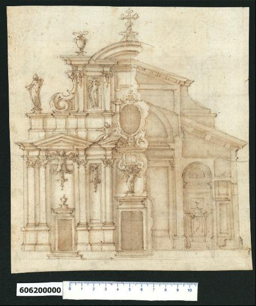 • NOTIZIE STORICO CRITICHE Nell'"Indice de due Tomi d'Intagli Tempietti ed altro", relativo ai tomi V e VI e compilato dal collezionista Giacomo Sardini, il disegno viene iscritto nel paragrafo "Chiese e loro parti" con la definizione "142 Facciata e spaccato".\nIl foglio riporta la proposta per una facciata di chiesa, disegnata sul lato sinistro (osservando il foglio) rispetto alla mezzeria, di cui è raffigurata sul lato destro la struttura retrostante.\nIl piano della chiesa è sopraelevato e all'ingresso centrale più ampio e quello laterale minore si accede tramite distinti scalini che avanzano dalla zoccolatura.\nLa nuova facciata è applicata come un decoro alla struttura della chiesa ed è costituita da un assemblaggio di elementi decorativi che in alcuni casi simulano una funzione strutturale.\nL'ingresso laterale è sormontato da una cornice sagomata che funge da piedistallo per un'urna ed è inserito in un'alta campitura rettangolare contornata da due colonne corinzie su alto basamento che portano un frontone triangolare spezzato alla base, a cui è appeso un mezzo angelo con corpo a pendente vegetale. La colonna di sinistra è affiancata da una seconda che regge il cornicione sporgente, mentre a lato della colonna di destra è una nicchia o riquadratura a tutta altezza, decorata con un altro mezzo angelo simile al precedente, affiancata dalla colonna che individua la campitura centrale. \nL'ingresso centrale è sovrastato da una sequenza di elementi decorativi che sembrano sorreggere il successivo: un cornicione sagomato che funge da piedistallo per un angelo che sostiene una riquadratura con volute laterali. Sopra questa si trova una cornice che regge la testa di un cherubino; questo con le ali a voluta funge da base per l'apertura ovale superiore, indicata dall'angelo disteso sopra il frontone curvilineo spezzato portato dalla colonna laterale. Un'ulteriore riquadratura per iscrizione completa la sequenza.\nGli elementi della zona superiore sono congegnati per mascherare le coperture a falda della chiesa, come si evince dal disegno tracciato sulla destra del foglio. Una doppia fascia in muratura articolata da sostegni, maschera la falda del tetto della navata laterale, mentre quella centrale più alta affiancata da un contrafforte curvilineo, è celata da una composizione con due piedritti rastremati decorati superiormente da una piccola figura di mezzo angelo con corpo a pendente, inframmezzati da una nicchia con statua e sorretti a lato da un mezzo angelo con corpo a voluta vegetale. \nI piedritti sostengono infine gli elementi conclusivi della composizione: un breve cornicione sporgente che funge da piedistallo per un'urna fumante e un frontone curvilineo spezzato alla base al cui culmine è posta una croce trilobata su piedistallo.\nIl profilo ascendente della facciata individuato dall'urna e dalla croce, è completato a livello inferiore dalla statua che svetta all'estremità della fascia in muratura mediana.\nCome per il disegno precedente (Milano, Collezione Sardini Martinelli inv. 6,61b) la chiesa non è identificabile e potrebbe trattarsi di un progetto non realizzato attribuibile però per analogia stilistica a Giovanni Battista Montano.\nIl disegno, è attribuito a Montano anche da V. Pracchi su segnalazione di A. Bedon (Pracchi, 1991 p. 19) e indicato da L. Fairbairn (Fairbairn, 1998 vol. II, Appendix 8, p. 770).