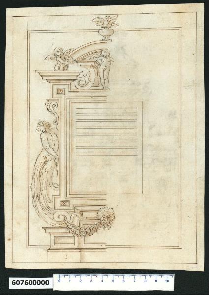 - NOTIZIE STORICO CRITICHE Nell'"Indice de due Tomi d'Intagli Tempietti ed altro", relativo ai tomi V e VI e compilato dal collezionista Giacomo Sardini, il disegno viene iscritto nel paragrafo "Imagini ornate Iscrizioni" con la definizione "149 Iscrizione".\nIl disegno, attribuito a Giovanni Battista Montano da V. Pracchi su segnalazione di A. Bedon (Pracchi, 1991 p. 19) e indicato da L. Fairbairn (Fairbairn, 1998 vol. II, Appendix 8, p. 770), rappresenta solo metà della cornice per iscrizione decorata e si suppone perciò che la parte mancante ne riprendesse specularmente gli ornamenti. \nLa cornice sagomata con angoli estroflessi che racchiude il riquadro con il tracciato per l'iscrizione, appare sostenuta da una base con zoccolatura a pavimento articolata in riquadrature e da una serie di elementi collegati tra di loro che da qui si sviluppano con la duplice funzione decorativa e statica.\nSulla riquadratura centrale della base, più alta, poggia infatti un supporto decorato da un mascherone che sostiene centralmente la cornice, mentre l'angolo estroflesso in basso della stessa poggia sulla voluta che costituisce la parte terminale del corpo di una figura maschile la quale, sorretta dalla cornice della riquadratura laterale più bassa della base, a sua volta puntella la cornice sagomata lateralmente. \nIl mascherone e la voluta sopra descritta sono collegati da un festone di fiori e frutti.\nL'angolo estroflesso superiore della cornice, decorato al centro come quello inferiore da un piccolo riquadro con fiore, è sostento da una mensola a forma di testina di cherubino. Sopra l'angolo si staglia una cornice sagomata molto aggettante su cui è inginocchiato un angoletto indicante l'elemento centrale superiore e conclusivo della cornice. Questo è costituito da un frontone curvilineo spezzato alla base sostenuta da una voluta vegetale, al cui centro si staglia la figura eretta di un altro piccolo angelo. Al centro dell'estradosso del frontone si trova la consueta urna tipica delle composizioni di Montano. \nCome in altri disegni attribuiti a Montano, ad esempio la serie di altari (Milano, Collezione Sardini Martinelli invv. 6,30; 6,36; 6,49; 6,60; 6,69; 6,79; 6,80; 6,88; 6,93) o i disegni di cornici (Ibidem, invv. 6,59 e 6,87a), la doppia marginatura entra a far parte della composizione: la linea più esterna in genere in basso funge da base di appoggio, mente la doppia linea più interna incornicia ma non delimita il disegno, che in alcuni punti la taglia o sborda dalla stessa, con gli elementi decorativi terminali (in questo caso l'urna in alto e la base di sostegno in basso).\nLa soluzione architettonica e decorativa è sicuramente invenzione di Montano; non si ha invece certezza sull'esecutore del disegno, che potrebbe anche essere un lavorante della sua bottega.\nIl disegno ha delle similitudini con un'altra cornice schizzata a tratto veloce da Montano, conservata in un Album di Madrid (Biblioteca Nacional, Album di Antonio Garcia Reinoso n. AB 901 verso).