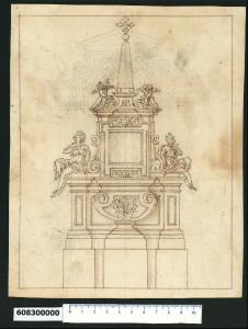 - NOTIZIE STORICO CRITICHE Nell'"Indice de due Tomi d'Intagli Tempietti ed altro", relativo ai tomi V e VI e compilato dal collezionista Giacomo Sardini, il disegno viene iscritto, insieme ad altro foglio già incollato sul lato opposto del medesimo supporto di legatura, nel paragrafo "Mausolei sepolcrali" con la definizione "151 152 magnifico ed altro piccolo".\nSul foglio in esame è tracciato il disegno di un monumento funebre o cenotafio. Sulla parte centrale dell'alta zoccolatura liscia articolata in tre parti avanzate e oltre l'ulteriore zoccolatura sagomata del basamento, si erge un sepolcro su piedistallo con una base dalla forma curvilinea individuata da due volute contrapposte al cui centro si sviluppa un motivo vegetale inserito in una campitura sagomata. \nIl sepolcro (o la sua rappresentazione) si staglia quindi sullo sfondo della campitura centrale riquadrata del basamento, affiancato dagli altre due elementi verticali, pure riquadrati e leggermente avanzati, che lo compongono. Sul cornicione superiore si sviluppa l'apparato decorativo della composizione: una campitura per effige o iscrizione circondata da una cornice sagomata, alla cui base è posta una testa di cherubino, è sostenuta ai lati da volute vegetali e affiancata da due figure femminili drappeggiate sedute che la indicano. I due angoli estroflessi della cornice sostengono attraverso due piedritti al cui centro è una testa di cherubino simile alla precedente, un frontone spezzato a volute sormontato da angioletti, tra cui si erge sopra un piedistallo sagomato un elemento a forma di obelisco su sfere culminante in una croce trilobata.\nIl disegno, attribuito a Giovanni Battista Montano da V. Pracchi su segnalazione di A. Bedon (Pracchi, 1991 p. 20) e da L. Fairbairn (Fairbairn, 1998 vol. II, Appendix 8, p. 771), è incorniciato da una marginatura semplice e trova corrispondenza pressoché perfetta in un disegno conservato nel Codice di Parigi (MS Hb, 22 - 4, f. 92v consultato nel microfilm F 9401).\nLa soluzione architettonica e decorativa è sicuramente invenzione di Montano; non si ha invece certezza sull'esecutore del disegno. \nLa definizione accurata e il tratto formale che lo caratterizzano, si scostano infatti dalla spontaneità e freschezza di altri disegni di Montano. La diversità di stile potrebbe imputarsi allo scopo del disegno stesso (la vendita o la formazione di un album di repertori da pubblicare), o in quanto affidato per la stesura definitiva a un lavorante della sua bottega.\nAltri disegni all'interno della Collezione (Milano, ibidem, invv. 6,46b; 6,47a; 6,64a) e i corrispettivi del Codice di Parigi (MS Hb, 22 - 4, ff. 86 e 89 consultati nei microfilm F9388 e F9394) richiamano due elementi caratterizzanti di questo disegno: l'obelisco con sfera e croce trilobata superiore e la cornice che racchiude (o potrebbe racchiudere) il busto su piedistallo.