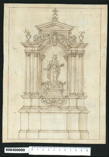 - NOTIZIE STORICO CRITICHE Nell'"Indice de due Tomi d'Intagli Tempietti ed altro", relativo ai tomi V e VI e compilato dal collezionista Giacomo Sardini, il disegno viene iscritto, insieme ad altro foglio già incollato sul lato opposto del medesimo supporto di legatura, nel paragrafo "Mausolei sepolcrali" con la definizione "153 a 4 colonne e senza colonne".\nIl foglio in esame presenta il disegno di un monumento funebre a parete simmetrico secondo la mezzeria. Sulla parte centrale più avanzata dell'alto basamento, articolato su più piani verticali e che si eleva da una zoccolatura a pavimento che ne segue l'andamento, è posto il sepolcro la cui base posta su un piedistallo ha una forma arrotondata in forma di due volute contrapposte dai cui occhi si dipartono due drappi trattenuti al centro dalla testa di un cherubino. A livello del coperchio di chiusura del sepolcro si staglia una figura femminile drappeggiata posta su piedistallo, su cui sono seduti i due angioletti che l'affiancano. La figura è inserita in una cornice sagomata con due testine di cherubino agli angoli d'imposta dell'arco superiore, su cui sono distesi due angeli che sorreggono un'arme gentilizia posta sulla chiave di volta.\nLa cornice è affiancata ai lati da due coppie di colonne ioniche con proprio basamento e che mostrano alternativamente i due versi del capitello, su cui è impostata la trabeazione con cornicione aggettante laterale e frontone triangolare interrotto interno. Il primo sorregge due urne fumanti su ciascun lato, il secondo due mensole a volute contrapposte che reggono l'elemento terminale della composizione: una riquadratura posta alle spalle dell'arme gentilizia sopra descritta, sormontata da un frontone triangolare e un'urna con croce trilobata su piedistallo.\nIl disegno, attribuito a Giovanni Battista Montano da V. Pracchi su segnalazione di A. Bedon (Pracchi, 1991 p. 20) e da L. Fairbairn (Fairbairn, 1998 vol. II, Appendix 8, p. 771), è incorniciato da una marginatura semplice e ha una similitudine nella parte centrale della composizione col disegno conservato a Berlino n. 596 (Staatliche Museen, Kunstbibliothek).\nLa soluzione architettonica e decorativa è sicuramente invenzione di Montano; non si ha invece certezza sull'esecutore del disegno. \nLa definizione accurata e il tratto formale che lo caratterizzano, si scostano infatti dalla spontaneità e freschezza di altri disegni di Montano. La diversità di stile potrebbe imputarsi allo scopo del disegno stesso (la vendita o la formazione di un album di repertori da pubblicare), o in quanto affidato per la stesura definitiva a un lavorante della sua bottega.