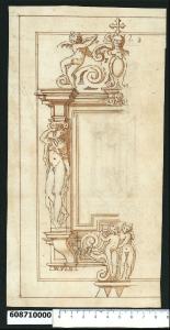 - NOTIZIE STORICO CRITICHE Nell'"Indice de due Tomi d'Intagli Tempietti ed altro", relativo ai tomi V e VI e compilato dal collezionista Giacomo Sardini, il disegno viene iscritto nel paragrafo "Imagini ornate Iscrizioni" con la definizione "154 altra d[ett]a / 154 Iscrizione".\nIl disegno è attribuito a Giovanni Battista Montano da V. Pracchi su segnalazione di A. Bedon (Pracchi, 1991 p. 19) e indicato da L. Fairbairn (Fairbairn, 1998 vol. II, Appendix 8, p. 770). \nEsso rappresenta solo metà della cornice decorata che probabilmente doveva racchiudere un'immagine o un'iscrizione e si suppone perciò che la parte mancante ne riprendesse specularmente gli ornamenti. \nLa cornice sagomata presenta alla base due angioletti su mensola sorretta da dentelli, di cui quello a sinistra affiancato da una doppia voluta contrapposta. Accanto a questa si protende una mensola a voluta ornata alla base da dentelli triangolari minori, che sorregge un'erma maschile con drappo che scende sul retro dalle spalle. I centri delle due volute sono uniti da una ghirlanda di frutti. \nL'erma sorregge col capo e con la mano destra un capitello ionico sul quale, tramite un piedritto cubico, poggia il cornicione aggettante conclusivo. Al centro del cornicione su una base sorretta dalla testa di un cherubino, si trova uno stemma non definito, sormontato da un elmo con ali a voluta laterali e croce trilobata superiore, affiancato da una doppia voluta contrapposta su cui poggia l'angioletto che la indica. \nL'impostazione di questo disegno è molto simile ad altri presenti all'interno della Collezione Sardini Martinelli, tra cui in particolare quello di cui all'inv. 4,14. Queste cornici sono caratterizzate da una compresenza di elementi architettonici ed altri propriamente decorativi piegati spesso a un'apparente funzionalità statica nella composizione.\nAnche in questo caso, come in altri disegni attribuiti a Montano, ad esempio la serie di altari (Milano, Collezione Sardini Martinelli invv. 6,30; 6,36; 6,49; 6,60; 6,69; 6,79; 6,80; 6,93) o i disegni di cornici (Ibidem, invv. 6,59 e 6,76), la doppia marginatura entra a far parte della composizione: la linea più esterna in genere in basso funge da base di appoggio, mente la doppia linea più interna incornicia ma non delimita il disegno, che in alcuni punti la taglia o sborda dalla stessa, con gli elementi decorativi terminali (in questo caso la croce trilobata in alto e la mensola di sostegno in basso).\nLa soluzione architettonica e decorativa è sicuramente invenzione di Montano; non si ha invece certezza sull'esecutore del disegno, che potrebbe anche essere un lavorante della sua bottega.