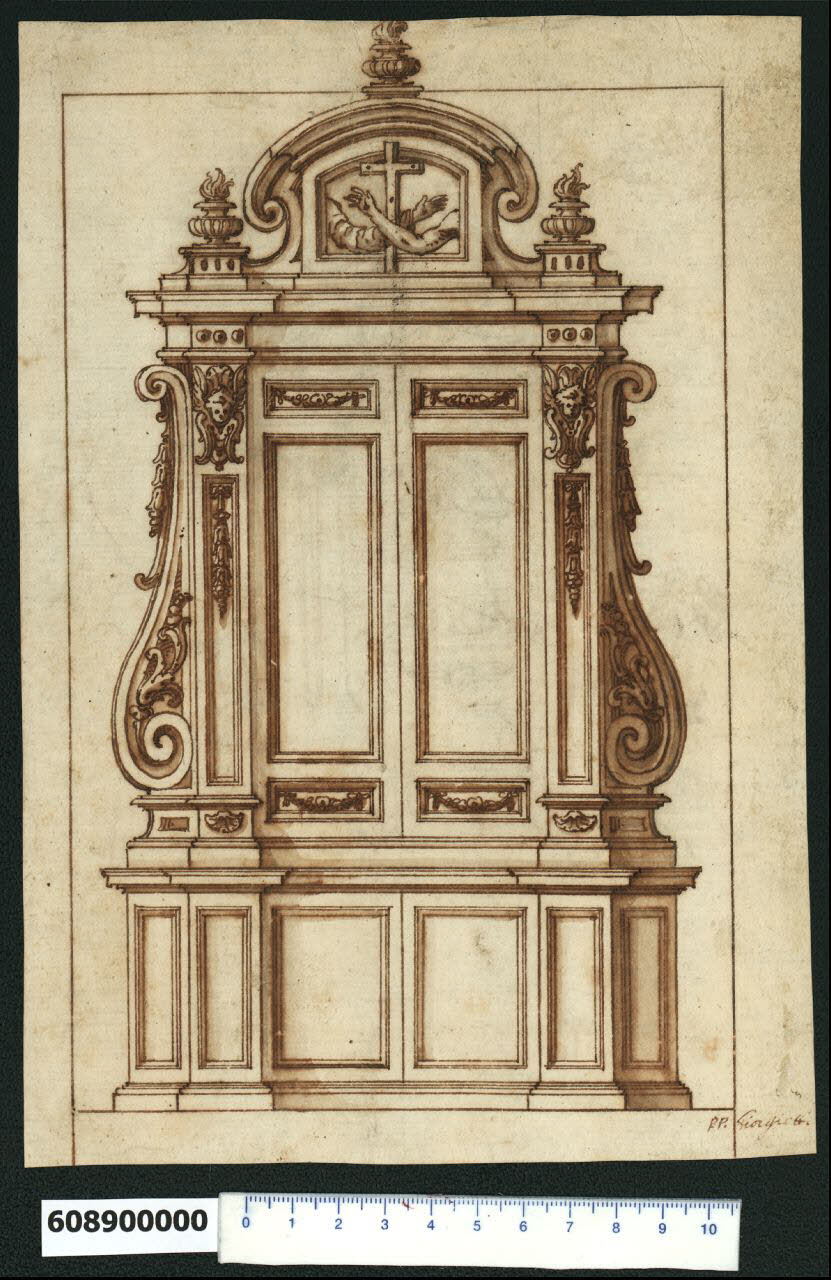 - NOTIZIE STORICO CRITICHE Nell'"Indice de due Tomi d'Intagli Tempietti ed altro", relativo ai tomi V e VI e compilato dal collezionista Giacomo Sardini, il disegno viene iscritto sia nel paragrafo "Banchi" con la definizione "155 con lo stemma di S. Francesco", sia nel paragrafo "Gabinetti" con la definizione "155 a due sportelli".\nIl disegno, firmato nell'angolo inferiore destro, è opera di Pietro Paolo Giorgetti, intagliatore che era stato al servizio del cardinale Francesco Barberini prima del suo esilio (Montagu 1970, p. 279). La Fairbairn (1998, p. 771) lo attribuisce erroneamente a Giovanni Battista Montano.\nLa presenza nel cartiglio a coronamento della struttura dell'emblema di S. Francesco, porta ad ipotizzare che potesse essere destinato ad una sacrestia o ad altro ambiente di edificio religioso. L'armadio a due ante consta di un registro inferiore sul quale si imposta il contenitore più alto con sportelli ornati da semplici cornici, delimitati da due lesene decorate da teste alate di cherubino e fiori. Ai lati, in posizione arretrata, due grandi volute con elementi vegetali.