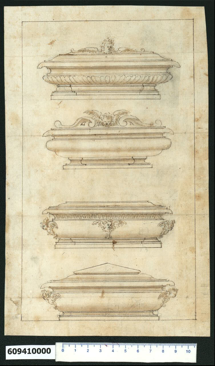 - NOTIZIE STORICO CRITICHE Nell'"Indice de due Tomi d'Intagli Tempietti ed altro", relativo ai tomi V e VI e compilato dal collezionista Giacomo Sardini, il disegno viene iscritto nel paragrafo "Mausolei sepolcrali" con la definizione "158 urne".\nAll'interno della marginatura del foglio sono disegnati quattro esemplari di casse da sepoltura di foggia e decorazione differenti, tutte sollevate su una base modanata e con fondo e coperchio variamente sagomati e modanati in forme curvilinee. Riguardo alle decorazioni, la prima dall'alto ha il fondo decorato a baccelli, mentre sopra il coperchio è la testa di un angelo ad ali distese; nella seconda la testa di cherubino sopra il coperchio è posta al centro di due volute e ha le ali sollevate; la terza cassa presenta tre teste di cherubino sul fondo di cui due ai lati e una al centro, mentre nell'ultima i cherubini si trovano solo ai lati e il coperchio si eleva in forma triangolare.\nIl disegno è attribuito a Giovanni Battista Montano da V. Pracchi su segnalazione di A. Bedon (Pracchi, 1991 p. 19) e da L. Fairbairn (Fairbairn, 1998 vol. II, Appendix 8, p. 771).\nNon si ha certezza che l'esecutore del disegno sia Montano o un lavorante della sua bottega.\nUn altro disegno di Montano di cassa intagliata più elaborata si trova tra gli atti di Giovanni Battista Carnevali (Roma, Archivio di Stato, Trenta notai capitolini, uff. 22, t. 15 f. 209 - doc. n. 7), pubblicato da L. Marcucci (Marcucci, 2008 p. 56 fig. 30).