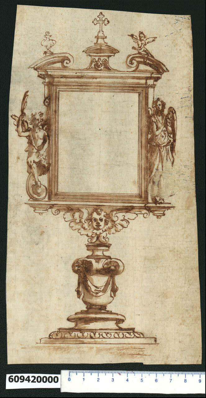 - NOTIZIE STORICO CRITICHE Nell'"Indice de due Tomi d'Intagli Tempietti ed altro", relativo ai tomi V e VI e compilato dal collezionista Giacomo Sardini, il disegno viene iscritto, insieme ad altro foglio già incollato sul lato opposto del medesimo supporto di legatura, nel paragrafo "Reliquario" con la definizione "158 quadro e rotondo".\nDella suppellettile ecclesiastica qui rappresentata, probabilmente un reliquiario come indicato da Sardini, sono presentate due varianti rispetto alla mezzeria.\nIl piedistallo, comune alle due versioni, ha una larga base sagomata decorata con motivo grecato a doppia foglia, su cui poggia un sostegno ornato da una sorta di cartoccio a volute dai cui occhi pende un drappo. Sopra questo un piccolo piedistallo sormontato da una testa di cherubino le cui ali dispiegate portano la teca superiore rettangolare, affiancata a sinistra da un angelo seduto su voluta con in mano la palma del martirio e a destra un altro angelo con un mano un frutto (forse una pera). La teca termina superiormente con un frontone interrotto a volute contrapposte verso un piedistallo centrale con testina d'angelo, sormontato da un piccolo frontone curvilineo su cui poggia una croce trilobata sollevata su piedistallo. Sopra le due volute si trovano a sinistra un'urna e a destra un angioletto seduto. \nIl disegno è attribuito a Giovanni Battista Montano da V. Pracchi su segnalazione di A. Bedon (Pracchi, 1991 p. 20) e da L. Fairbairn (Fairbairn, 1998 vol. II, Appendix 8, p. 771).