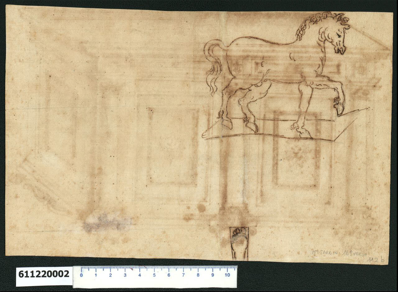 - NOTIZIE STORICO CRITICHE Il disegno mostra un cavallo con la zampa anteriore destra sollevata, forse parte di una scultura equestre, come suggerirebbe il ripiano sopra il quale è appoggiato. Tangente il margine inferiore è raffigurala la pianta di un piede.