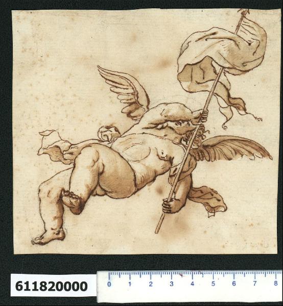 - NOTIZIE STORICO CRITICHE il foglio 118b, già impaginato sul supporto con n. antico 172, non è citato in indice.\nIl disegno raffigura un angelo nudo in volo, che regge con entrambe le mani uno stendardo.