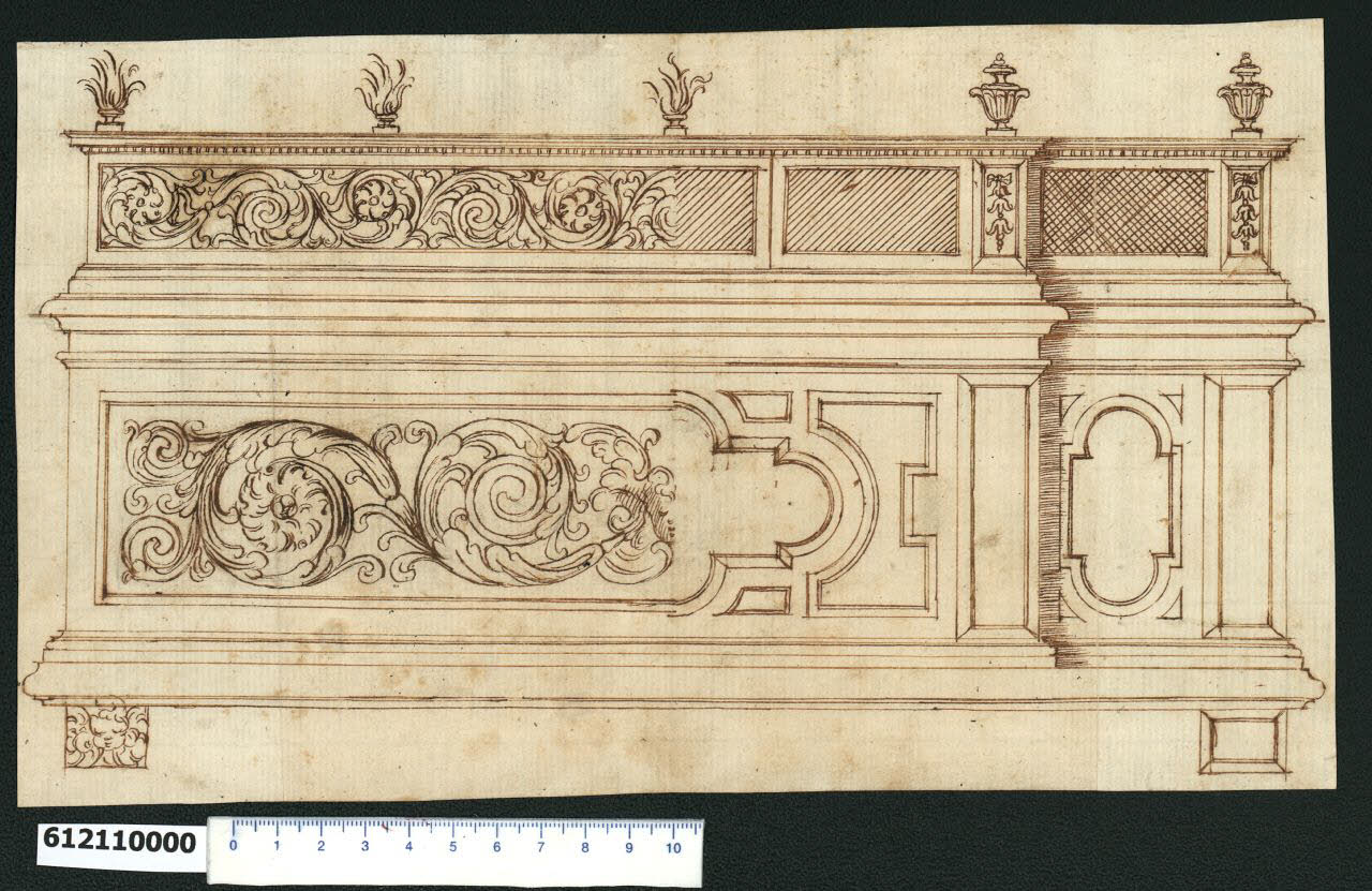 - NOTIZIE STORICO CRITICHE Nell'"Indice de due Tomi d'Intagli Tempietti ed altro", relativo ai tomi V e VI e compilato dal collezionista Giacomo Sardini, il disegno viene iscritto nel paragrafo "Gabinetti" con la definizione "174 altra come sopra" [si legga: credenza].\nL'attribuzione del disegno a Giovanni Battista Montano fatta da Valeria Pracchi (1991, 2a parte, p. 23) su segnalazione di Anna Bedon, è confermata dalla Fairbairn (1998, p. 771). Mentre la Fairbairn mantiene l'identificazione del soggetto data da Sardini, la Pracchi lo individua come transenna. L'assenza nel disegno di elementi riferibili ad ante, cassetti o altro, tipici di un contenitore, fa propendere per la proposta della Pracchi. Alternativa possibile è che il disegno si riferisca alla pediera di un letto.\nSopra due piedi cubici, uno ornato con testa di cherubino, si imposta un lungo pannello per il quale sono previste due soluzioni. A sinistra lo spazio è interamente occupato da girali floreali, che si ripetono, anche nella fascia terminale, sormontata da vasi fiammeggianti. A destra, il pannello ha profondità diverse, e decorazioni geometriche tra le quali è possibile riconoscere la figura del rettangolo con terminazione semicircolare che Marcucci (2008, p. 69), riferendosi al disegno in Milano, Collezione Sardini Martinelli inv. 6,146 recto, associa a quello utilizzato da Montano nel soffitto di S. Giuseppe dei Falegnami e in quello distrutto dell'oratorio della SS. Trinità dei Pellegrini e successivamente impiegato da Sergio Venturi e G.B. Soria nel soffitto di S. Grisogono. La fascia superiore, suddivisa in scomparti con tratteggi diagonali e incrociati, termina con vasi .