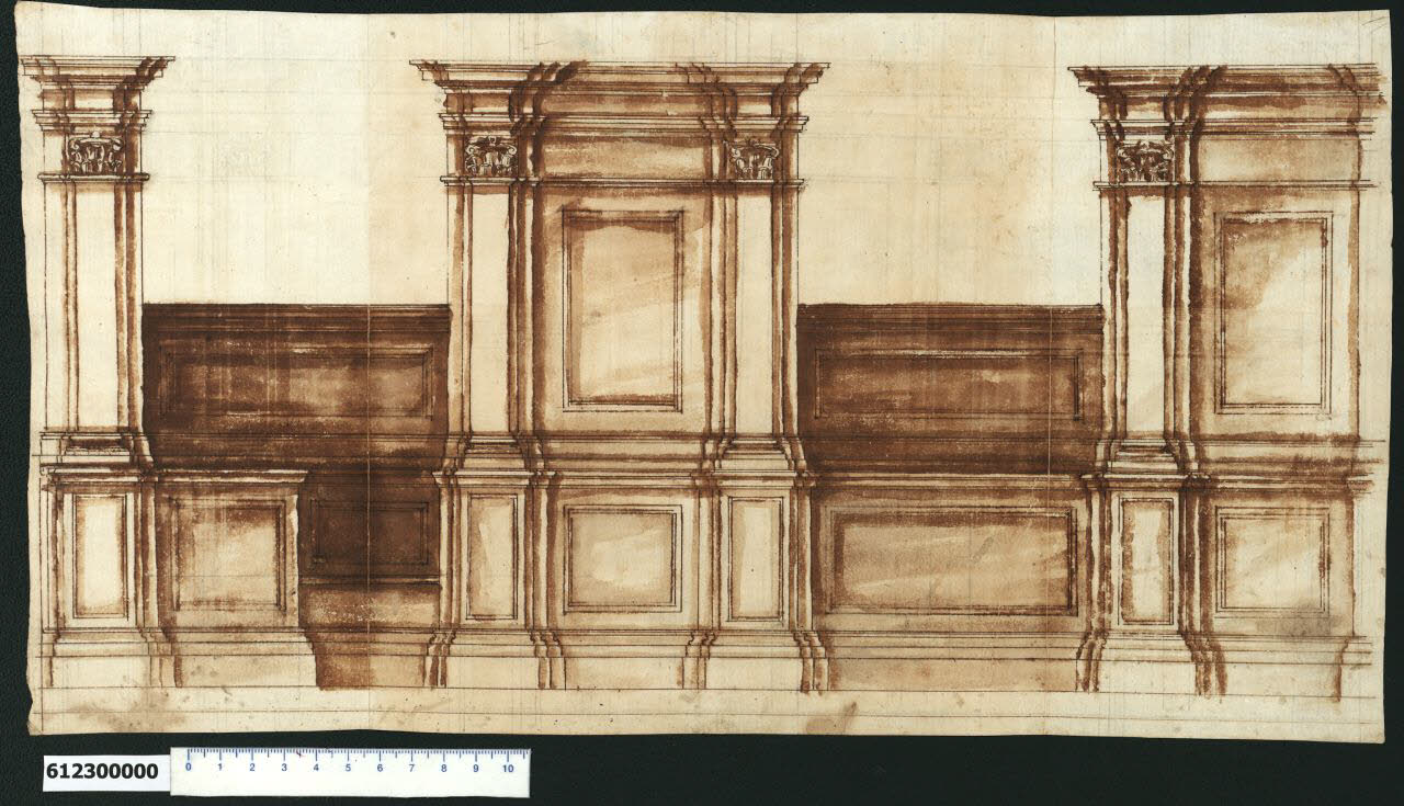 • NOTIZIE STORICO CRITICHE Nell'"Indice de due Tomi d'Intagli Tempietti ed altro", relativo ai tomi V e VI e compilato dal collezionista Giacomo Sardini, il disegno viene iscritto nel paragrafo "Banchi" con la definizione "... 175 scansia".\nV. Pracchi, che attribuisce l'opera a Giovanni Battista Montano su segnalazione di A. Bedon (Pracchi, 1991 p. 20), definisce invece il soggetto "Stalli per coro".\nSicuramente si tratta di arredi ecclesiastici, ma più probabilmente di armadi lignei per sagrestia, come rileva L. Marcucci riscontrando una similitudine con quelli delle chiese romane di S. Andrea della Valle e del Gesù, caratterizzati da una sequenza di elementi alti e bassi (Marcucci, 2008 p. 41 figg. 19-20).\nSeguendo le indicazioni di F. Bilancia, L. Marcucci nota che Montano lavorò per l'Arciconfraternita della Trinità dei Pellegrini (1588 e ss.) di cui era protettore Alessandro Peretti Montalto e per S. Lorenzo in Damaso (1599 e ss. e nel 1612) quando lo stesso cardinale era titolare e cancelliere. Il Montalto era pure titolare di S. Andrea della Valle, quando si eseguirono gli armadi della sagrestia, per cui la Marcucci suggerisce un possibile affidamento del lavoro a Montano o a un artista derivante dalla sua Scuola. Seppure non sia possibile relazionare il disegno in esame a tali opere, si osserva un'analogia nella fattura, caratterizzata da un'impostazione "architettonica" dell'arredo, dove la campitura centrale degli elementi più alti, divisa in due riquadrature, è delimitata da una sorta di "paraste" con capitello corinzio su alti piedistalli riquadrati, sorreggenti un "cornicione" sporgente.