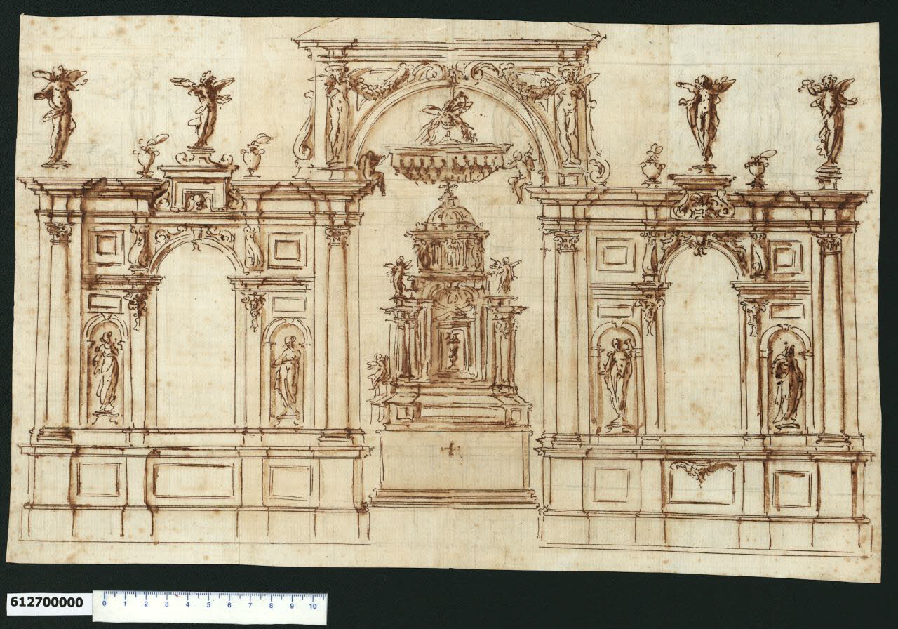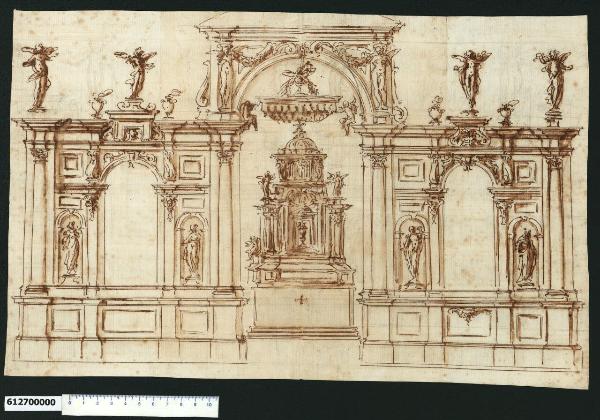 - NOTIZIE STORICO CRITICHE Nell'"Indice de due Tomi d'Intagli Tempietti ed altro", relativo ai tomi V e VI e compilato dal collezionista Giacomo Sardini, il disegno viene iscritto nel paragrafo "altari diversi" con la definizione "177 altro come sopra" [si legga: con ornati laterali].\nL'attribuzione del disegno a Giovanni Battista Montano fatta da Valeria Pracchi (1991, 2a parte, p. 23) su segnalazione di Anna Bedon, è confermata dalla Fairbairn (1998, p. 771).\nIl disegno raffigura il prospetto di un altare che richiama il modello dell'arco di trionfo che si eleva su un alto basamento il cui profilo aggetta in corrispondenza delle superiori lesene e colonne corinzie che reggono la trabeazione. L'arco centrale si imposta al di sopra della trabeazione ed è inquadrato da una struttura delimitata da lesene con anteposte statue di angeli che reggono ghirlande, e decorata ai lati da volute il cui profilo è leggermente diverso. Alla chiave di volta è appeso un angioletto che insieme ad altri due seduti sulla trabeazione reggono la copertura del tabernacolo. Quest'ultimo è articolato con un corpo principale, che ospita il calice con l'eucarestia entro una nicchia con copertura a catino costolonata, prevede a sinistra due colonne corinzie, e a destra un pilastro con lesena rastremata verso il basso, che reggono una trabeazione ornata da angeli su piedistalli. Il tamburo, ornato da angeli, ripropone la nicchia centrale con catino e sostiene una cupola costolonata. I settori laterali sono sostanzialmente identici a parte le varianti dei fastigi sopra l'arco, e mostrano un arco con gli stipiti ornati da lesene e la ghiera delimitata da massicce volute. Ai lati, entro due nicchie sono poste delle statue.