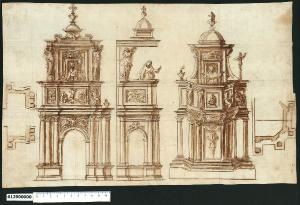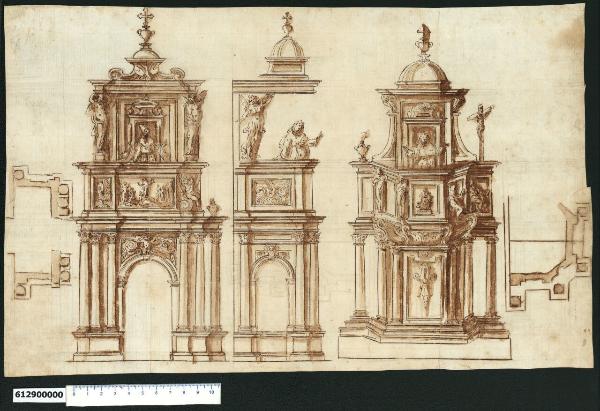 - NOTIZIE STORICO CRITICHE Nell'"Indice de due Tomi d'Intagli Tempietti ed altro", relativo ai tomi V e VI e compilato dal collezionista Giacomo Sardini, il disegno viene iscritto nel paragrafo "Mobili da Chiesa" con la definizione "178 altro d.o" [si legga: pulpito].\nIl disegno che è stato attribuito a Giovanni Battista Montano da Valeria Pracchi (1991, 2a parte, p. 23) su segnalazione di Anna Bedon (attribuzione poi confermata anche dalla Fairbairn 1998, p. 771 e dalla Marcucci 2008, p. 71), mostra tre esempi di pulpiti. Partendo da sinistra, l'autore delinea la pianta e l'alzato di una struttura a pianta rettangolare su colonne corinzie; due di queste sono poste agli angoli tangenti la muratura cui è addossato il pulpito, altre sono poste in corrispondenza dell'ingresso ma con soluzioni differenti. A sinistra due colonne corinzie, a destra un pilastro affiancato da due colonne. Quest'ultima articolazione non trova corrispondenza nel prospetto: infatti, mentre a sinistra si ritrovano esattamente le tre colone (una delle quali arretrata), a destra non appare il pilastro, ma solo tre colonne su singolo piedistallo. Il parapetto rettilineo del balcone, dotato di un pannello decorato, a sinistra risulta arretrato rispetto alla specchiatura rettangolare - la cui ampiezza è analoga a quella della struttura sottostante -, decorata con motivi vegetali racchiudenti un angelo, mentre a destra è affiancato da una voluta con cherubino, che occupa lo spazio corrispondente alle due colonne a lato della porta. Due sculture con angeli raccordano il parapetto con la trabeazione superiore ornata da un fastigio con cupoletta, vaso e croce. Al centro è delineato il prospetto laterale di un pulpito, con colonne corinzie su piedistallo che inquadrano una nicchia; al di sopra si imposta il balcone con pannello ornato da motivi vegetali. Un angelo regge con la mano sinistra la copertura che termina con una piccola cupola costolonata. A destra è tracciato il prospetto e parte della pianta di un pulpito a base semiottagonale, impostato su tre gradini. Colonne libere corinzie sono poste in corrispondenza degli angoli e inquadrano setti murari con nicchie e sfondati dotati di pannelli decorati. Massicce volute, con o senza testa alata di cherubino, mediano il passaggio verso il balcone superiore, che riprende il perimetro sottostante e mostra a sinistra pannelli lisci e spigoli con figure molto sporgenti, così come lo sono quelle che ornano i pannelli a destra. Due volute dal capitello con testa di cherubino delimitano il fondale che culmina con una cupola costolonata.\nIl presente foglio può essere relazionato con quello in Milano, Collezione Sardini Martinelli inv. 6,128, dal quale differisce per una maggiore attenzione al particolare decorativo e una stesura più equilibrata dell'acquerellatura.