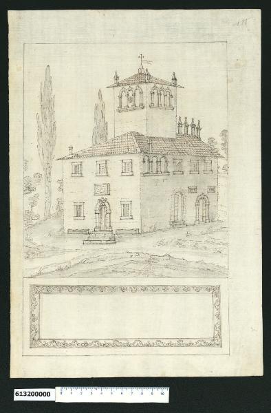 - NOTIZIE STORICO CRITICHE Il disegno iscritto nell'"Indice de due Tomi d'Intagli Tempietti ed altro" compilato dal collezionista Giacomo Sardini al paragrafo "Ornati" con la definizione "181. Fregio" non corrisponde al foglio in esame forse inserito nel tomo in sostituzione del preesistente con diverso soggetto.\nIl foglio presenta il disegno molto accurato di un edificio, definito all'interno di una marginatura e completato nella parte inferiore da una campitura con bordura decorativa dal motivo a foglie contrapposte ricorrenti, che probabilmente avrebbe dovuto contenere un'iscrizione. Si tratta quindi di un disegno di presentazione, ma non è possibile stabilire se destinato a una pubblicazione o ad altro scopo.\nL'edificio di impianto rettangolare con grande torretta che svetta al cento della copertura, è isolato e situato in una zona a verde affiancato da alberature dalla chioma allungata.\nNella facciata principale si aprono cinque finestre rettangolari, contornate e con vetri quadrettati, disposte regolarmente intorno all'ingresso ad arco in conci di pietra, rialzato da quattro gradini e affiancato da due panche in pietra. Il prospetto laterale presenta al piano terreno due ingressi sempre arcuati e contornati in conci, affiancati da piccole e basse finestrelle, mentre al piano superiore accanto a tre finestre rettangolari simili a quelle della fronte principale, si apre una trifora dai contorni in conci di pietra e davanzale unico, simile alle trifore che si trovano sulla sommità della torretta, probabilmente sui quattro lati. La copertura in tegole dell'edificio è completata dai camini, che si presentano anche nei quattro spigoli della copertura a falde della torretta.\nNon vi sono elementi sufficienti per attribuire il disegno, né per identificare l'edificio e la sua funzione: gli elementi che potrebbero fornire delle indicazioni sono la presenza di un'insegna sull'arco dell'ingresso principale, o l'iscrizione (illeggibile) sulla targa soprastante, le due panche ai lati dell'ingresso, la presenza sopra il tetto della torre di una croce con bandiera posta su tre monti (simbolo della famiglia Peretti Montalto) e di un orologio al centro della trifora frontale della torretta.\nL' ipotesi più accreditata è che si tratti di un edificio di ritiro spirituale, forse situato in zona collinare. Le porte degli ingressi sono rappresentate aperte, quasi a suggerire l'invito ad entrare e l'accoglienza.