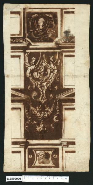 - NOTIZIE STORICO CRITICHE Nell'"Indice de due Tomi d'Intagli Tempietti ed altro", relativo ai tomi V e VI e compilato dal collezionista Giacomo Sardini, il disegno viene iscritto nel paragrafo "Porta" con la definizione "179 Imposte ornate".\nIl motivo principale del disegno è costituito dalle campiture decorate delimitate da due serie di riquadrature o aperture rettangolari ai lati: semplici e basse al primo e all'ultimo livello, più alte e in forma di edicola le centrali, con frontone curvilineo a volute contrapposte legate da ghirlanda la superiore e con frontone triangolare quella sottostante. \nLe campiture affrescate sono tre. Quella superiore è di forma pressoché quadrata con gli angoli inferiori smussati per la presenza dei frontoni curvilinei sopra citati che sbordano dalla riquadratura.\nIl soggetto raffigurato è una sorta di mascherone con un particolare copricapo (una specie di cimiero) visto di profilo, circondato da tralci fioriti che si ricongiungono in alto.\nLa campitura mediana, rettangolare, occupa lo spazio tra la cornice che prosegue tra i due frontoni curvilinei e il marcapiano delle due riquadrature con frontone triangolari sottostanti. Il motivo della decorazione è un volto femminile inquadrato da due figure femminili alate dal lungo collo, fitomorfe nella parte inferiore del corpo, che si uniscono in un pendente. Sotto questa immagine una ghirlanda di fiori e frutti appesa tramite i nastri alle estremità ai due frontoni triangolari sporgenti sopra descritti. La composizione è completata da un vaso di fiori e frutti sotto la ghirlanda apparentemente appoggiato al marcapiano.\nL'ultima campitura tra le due riquadrature inferiori più basse, ha forma rettangolare e contiene un mascherone di vecchio barbuto inserito in una riquadratura dai bordi laterali concavi affiancati da due fiori.