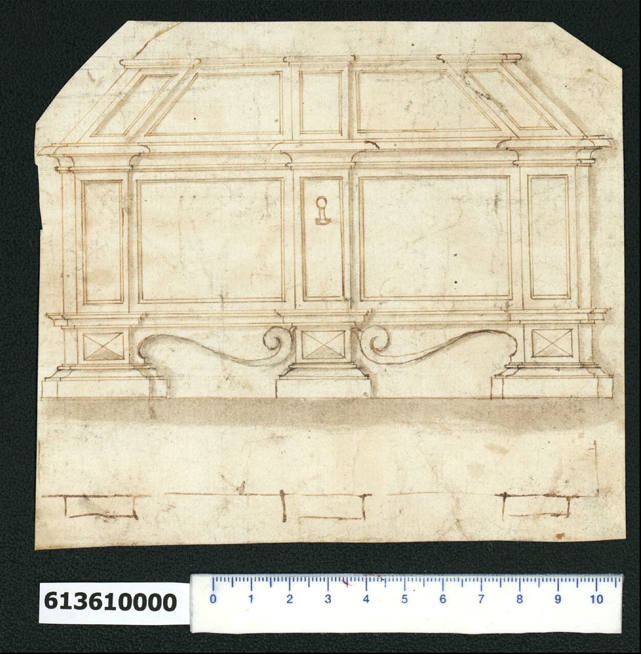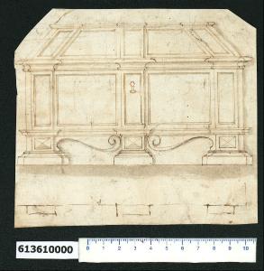 - NOTIZIE STORICO CRITICHE Nell'"Indice de due Tomi d'Intagli Tempietti ed altro", relativo ai tomi V e VI e compilato dal collezionista Giacomo Sardini, il disegno viene iscritto nel paragrafo "Gabinetti" con la definizione "183 cofano quadro", sia nel paragrafo "Mobili da Casa" con la definizione "... cofano 183".\nIl disegno raffigura un abbozzo di pianta e la prospettiva di un cassone. La pianta individua solo la posizione dei montanti verticali, mentre il prospetto mostra una struttura impostata su massicci piedi uniti da volute. La decorazione è semplice e si limita a cornici in rilievo che delimitano i pannelli.