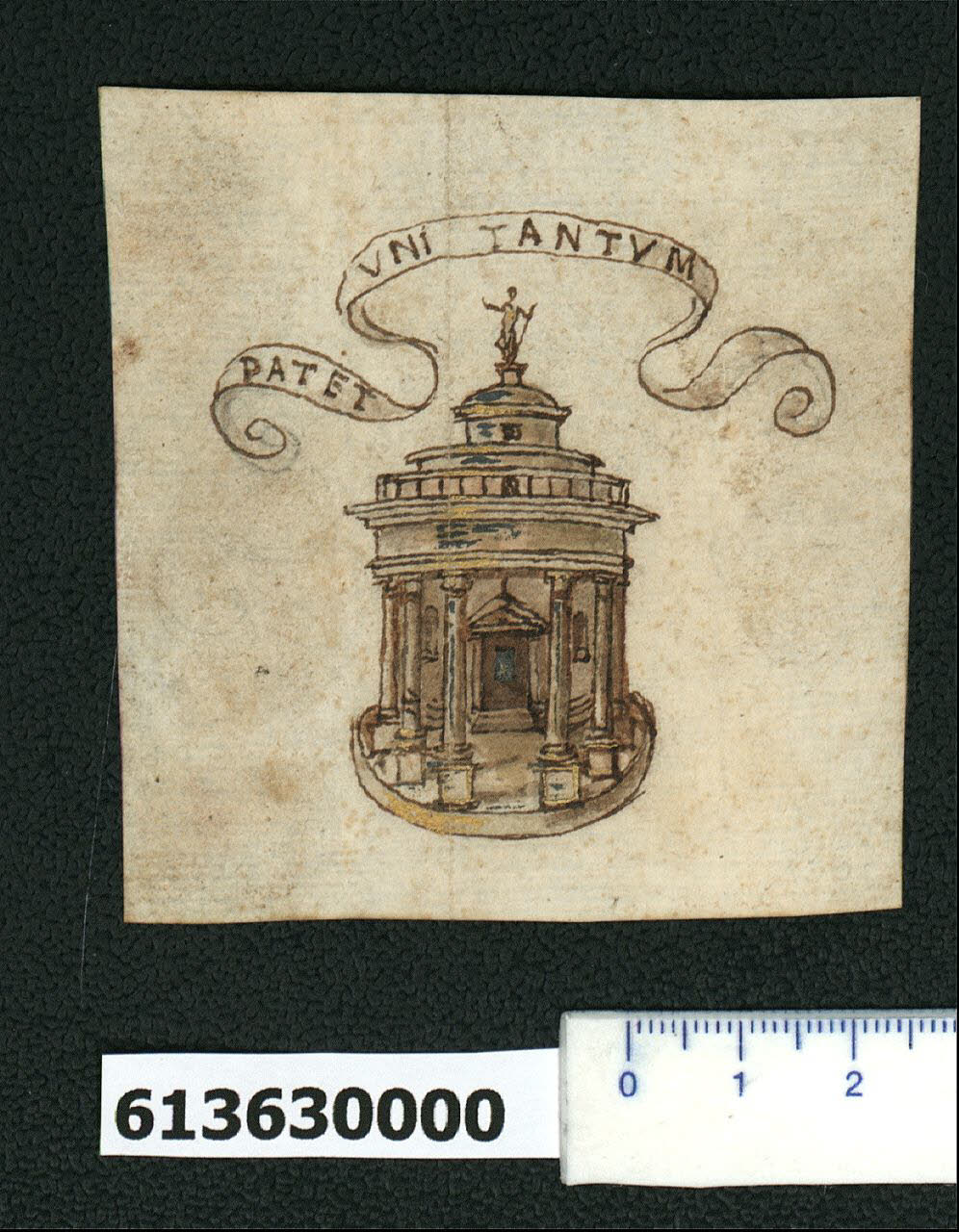 - NOTIZIE STORICO CRITICHE Nell'"Indice de due Tomi d'Intagli Tempietti ed altro", relativo ai tomi V e VI e compilato dal collezionista Giacomo Sardini, il disegno viene iscritto nel paragrafo "Imagini ornate Iscrizioni" con la definizione "183 Iscrizione".\nIl foglio riporta il disegno in prospettiva di un tempietto di forma circolare il cui nucleo posto su una base è circondato da colonne su alti piedistalli. Sopra l'alta trabeazione circolare con cornice superiore aggettante, è impostata una copertura a due piani digradanti che culminano in una sorta di tamburo coperto da calotta su cui si erge una statua su piedistallo. Al piccolo edificio si accede tramite un portale sovrastato da frontone triangolare, affiancato da due finestrelle arcuate.\nLa rappresentazione è sovrastata da un nastro ricurvo che porta un'iscrizione latina. \nIl tempietto si ispira ai martyria paleocristiani e ricorda San Pietro in Montorio.\nNon è noto l'autore del disegno, non segnalato da A. Bedon come opera di Montano (Pracchi, 1991).
