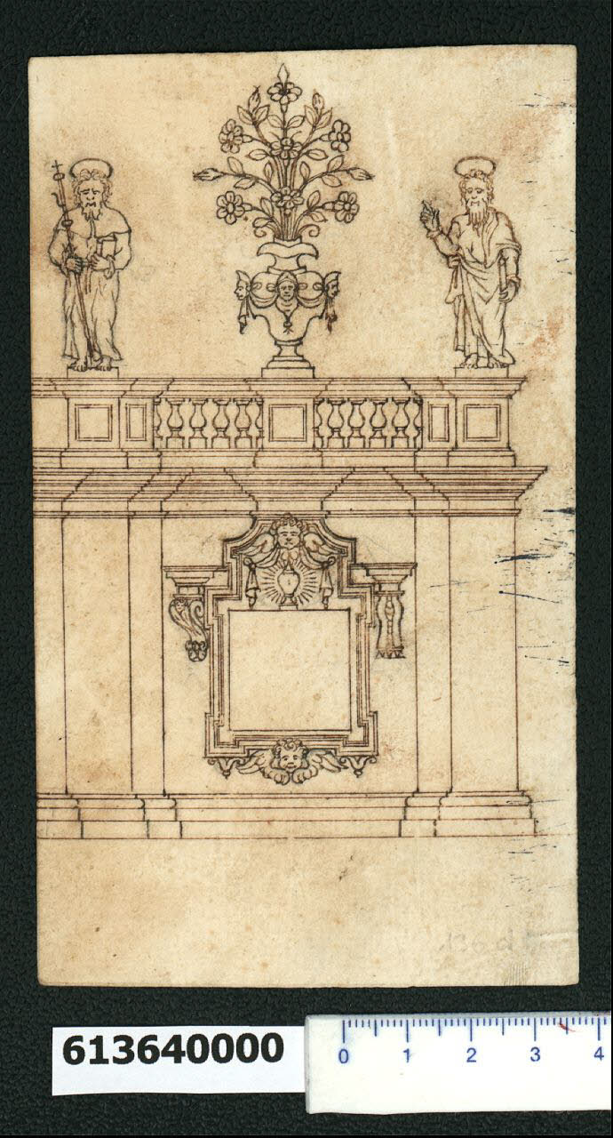- NOTIZIE STORICO CRITICHE Nell'"Indice de due Tomi d'Intagli Tempietti ed altro", relativo ai tomi V e VI e compilato dal collezionista Giacomo Sardini, il disegno viene iscritto, insieme ad altro foglio già incollato sul medesimo supporto di legatura, nel paragrafo "Case loro parti" con la definizione "183 Portici".\nIl disegno, variante di quello di cui all'inv. 6,136 b della presente Collezione, raffigura la parte di un edificio che presenta una serie di decorazioni a carattere religioso, incentrate su una cornice sagomata per iscrizione. In questo caso al posto dell'effige del volto di Cristo circondato dal sudario è posta la teca con l'Eucarestia racchiusa tra due drappi sostenuti dalla testa di un cherubino. L'immagine è inserita all'interno di un rialzo sagomato della cornice. Al lati due tratti di cornice che sono sostenuti sulla sinistra da una mensola a voluta con testina nella parte anteriore, e dall'altro da un elemento sagomato con motivo centrale a perline e dentelli inferiori. La cornice è sorretta nel lato inferiore da una testina di cherubino con ali distese e pendenti vegetali sotto gli spigoli sporgenti, come nel disegno di inv. 6,136 b.\nQuesta composizione è inserita in una parete ed affiancata da paraste sovrapposte su piani diversi, in questo caso prive di decorazioni e appoggianti su una base sagomata che non continua nella parte sottostante. Le paraste sorreggono invece anche in questo caso, tramite un cornicione sagomato e articolato, una balaustra intervallata da supporti riquadrati (raddoppiati quelli laterali) che sostengono al centro un vaso decorato da testine unite da drappi, in cui è inserita una composizione di fiori e foglie e ai lati due statue di santi: quello di sinistra regge un bastone con croce con la mano destra, mentre l'altro è raffigurato in atteggiamento benedicente.\nIl disegno non è segnalato da A. Bedon come opera di Montano (Pracchi, 1991); l'autore non è noto ma si possono trovare analogie stilistiche con alcuni disegni del quinto tomo della presente collezione (Milano, Collezione Sardini Martinelli invv. 5,65; 5,84; 5,126).