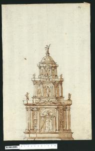 - NOTIZIE STORICO CRITICHE Nell'"Indice de due Tomi d'Intagli Tempietti ed altro", relativo ai tomi V e VI e compilato dal collezionista Giacomo Sardini, il disegno viene iscritto nel paragrafo "Tabernacoli" con la definizione "184 a tre ordini di colonne".\nIl disegno che è stato attribuito a Giovanni Battista Montano da Valeria Pracchi (1991, 2a parte, p. 23) su segnalazione di Anna Bedon, attribuzione poi confermata anche dalla Fairbairn 1998, p. 771, raffigura il prospetto di un tabernacolo, la cui pianta non è raffigurata, ma che le sporgenze degli assi principali fanno ipotizzare cruciforme. \nSopra uno zoccolo continuo, si innalzano pseudo pronai costituiti da colonne corinzie reggenti una trabeazione con soprastante timpano triangolare spezzato al centro dall'inserimento di un piedistallo con vaso. Il pronao inquadra un portale, anch'esso con timpano interrotto (motivo questo che ricorre per tutta la sequenza verticale centrale), mentre i setti murari laterali presentano nicchie con statue sormontate da specchiature. Il livello superiore ripropone il medesimo schema in misura ridotta, anche qui pseudo pronai, quello centrale con nicchia a tutto sesto sormontata da timpano a volute arricciate, raccordate da un vaso su piedistallo. Nel tamburo terminale ancora l'arco centrale con statue, e nicchie nei setti laterali. La cupola costolonata si imposta su una balaustra.\nLa soluzione compositiva delineata ripropone schemi e ornamenti tipici del repertorio di Montano, riscontrabili in altri suoi disegni, per tabernacoli o altari conservati sia a Milano, Collezione Sardini Martinelli (invv. 4.,1; 6,40; 6,41; 5,7; 5,8; 6,35), sia in altre collezioni europee, sia in parte pubblicati da G. B. Soria nell'opera "Tabernacoli diversi, nuovamente inventati da M. Giovanbatista Montano milanese ..." data alle stampe nel 1628.