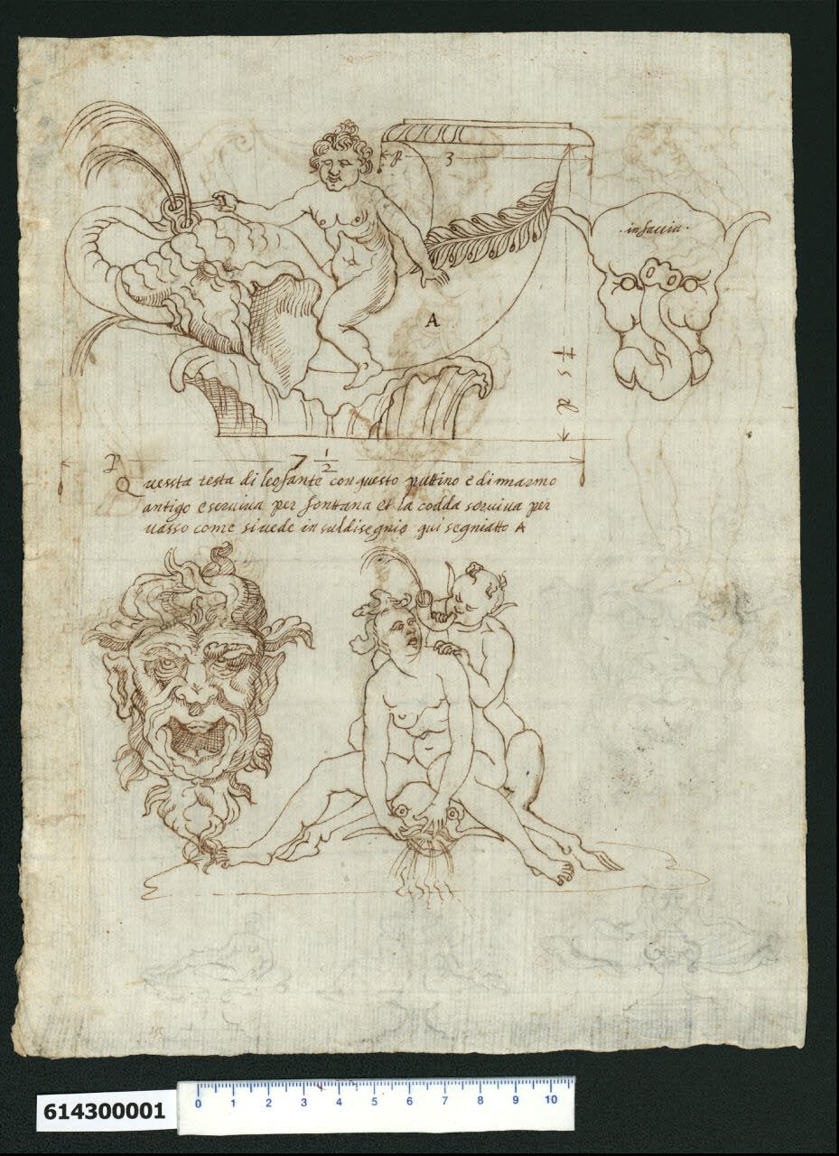 - NOTIZIE STORICO CRITICHE Nell'"Indice de due Tomi d'Intagli Tempietti ed altro", relativo ai tomi V e VI e compilato dal collezionista Giacomo Sardini, il disegno viene iscritto nel paragrafo "Fontane" con la definizione "186 con cornucopio".\nSul foglio in esame sono riportati i dettagli figurativi di due fontane. Il primo, nella parte superiore, è quotato e descritto nell'iscrizione sottostante, dalla quale si deduce che si tratta di un rilievo di un manufatto esistente.\nIl disegno rappresenta la testa di un elefante dalla cui bocca e proboscide rialzata escono zampilli d'acqua e il cui corpo, trasformato in un vaso ricurvo in forma di corno, appoggia sulla parte terminale (tagliata nel disegno) di un motivo vegetale, foglie o petali frastagliati e incurvati. A cavalcioni dell'elefante è un putto ignudo, che tiene sollevata la proboscide tramite un appiglio. Il vaso è decorato da uno stelo sinuoso con foglie ovalizzate e bacche e l'imboccatura presenta un bordo a mezzo toro decorato a fogliette. La testa dell'elefante è rappresentata anche frontalmente.\nNella parte sottostante del foglio si trovano altri due soggetti, sempre disegnati accuratamente con inchiostro tratteggiato a penna, di cui quello a sinistra rappresenta un mascherone di vecchio rugoso e con barba, orecchie appuntite da satiro e chioma fluente rialzata da cui spuntano a lato motivi vegetali. La bocca spalancata doveva probabilmente servire alla fuoriuscita dell'acqua.\nA destra è invece rappresentata una figura femminile a cavalcioni di un pesce o mostro marino dalle cui fauci tenute aperte dalle mani della fanciulla escono zampilli d'acqua che si riversa alla base. Accovacciato dietro la fanciulla e con la mano sinistra sopra la spalla, un satiro che soffiando dentro un corno ricurvo emette un getto d'acqua.\nSul foglio verso il margine inferiore si trovano ulteriori schizzi a matita di fontane, in questo caso complete di supporto e vasca, con figure variamente adagiate nell'invaso o lungo i bordi.\nDello stesso mascherone si intravede uno schizzo semi-cancellato sulla destra, forse preparatorio della soluzione tratteggiata a penna.\nLo stile sembra essere lo stesso dei disegni di cui agli invv. 6,133 R e 6,133 V (Milano, Collezione Sardini Martinelli).