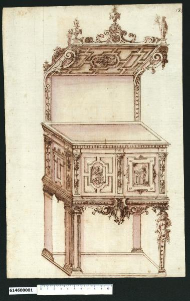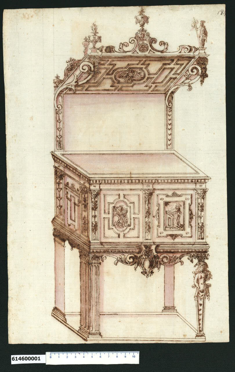 - NOTIZIE STORICO CRITICHE Nell'"Indice de due Tomi d'Intagli Tempietti ed altro", relativo ai tomi V e VI e compilato dal collezionista Giacomo Sardini, il disegno viene iscritto nel paragrafo "Mobili da Chiesa" con la definizione "189 Pulpito".\nL'attribuzione del disegno a Giovanni Battista Montano fatta da Valeria Pracchi (1991, 2a parte, p. 23) su segnalazione di Anna Bedon, è confermata dalla Fairbairn (1998, p. 771) e dalla Marcucci (2008, pp. 43, 69). Mentre la Fairbairn mantiene l'identificazione del soggetto data da Sardini, la Pracchi lo individua come armadio. Nonostante la tipologia raffigurata sia di difficile interpretazione, è comunque da escludere una destinazione a pulpito per la presenza di un piano/coperchio sopra il contenitore; potrebbe forse avvicinarsi più a uno stipo che a un armadio. \nPer la decorazione sono previste due soluzioni diverse: già per i sostegni verticali vengono proposte da un lato lesene angolari ioniche con fusto e capitello scanalati, dall'altro una cariatide. I pannelli dei prospetti, divisi da montanti con fiori e teste alate di cherubino, mostrano cornici entro le quali sono raffigurati santi. Nella figura del rettangolo a terminazione semicircolare, presente nel pannello a sinistra e nel cielo del mobile, la Marcucci (2008, p. 69) individua il motivo introdotto da Montano nel soffitto di S. Giuseppe dei Falegnami e in quello distrutto dell'oratorio della SS. Trinità dei Pellegrini, motivo poi ripreso da Sergio Venturi e G.B. Soria nel soffitto di S. Grisogono.