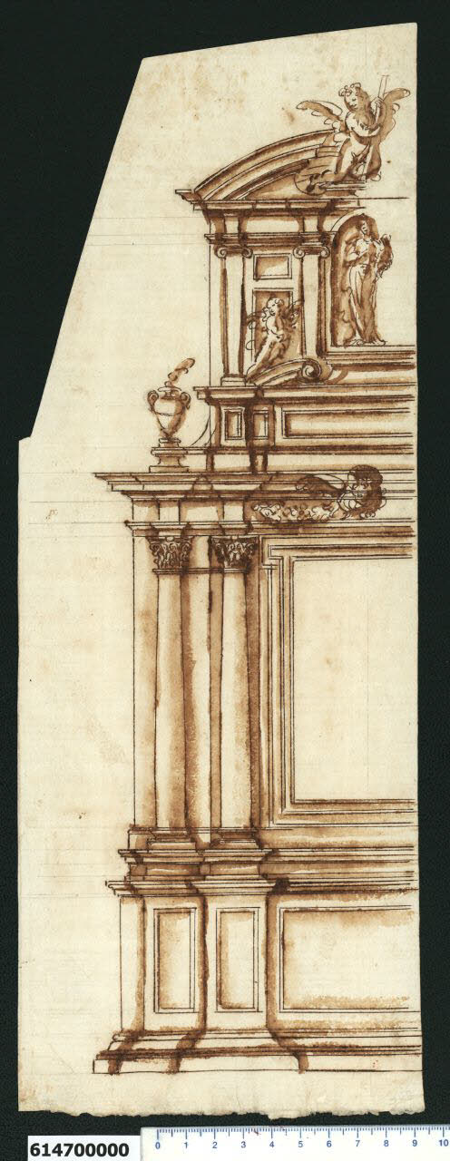 - NOTIZIE STORICO CRITICHE Nell'"Indice de due Tomi d'Intagli Tempietti ed altro", relativo ai tomi V e VI e compilato dal collezionista Giacomo Sardini, il disegno viene iscritto nel paragrafo "altari diversi" con la definizione "189 con nicchia superiore".\nL'attribuzione del disegno a Giovanni Battista Montano fatta da Valeria Pracchi (1991, 2a parte, p. 23) su segnalazione di Anna Bedon, è confermata dalla Fairbairn (1998, p. 770)\nIl disegno mostra la metà sinistra del prospetto di un altare con struttura molto semplice nella parte basamentale. Ai lati della pala d'altare si impostano due colonne corinzie che reggono la trabeazione decorata da una ghirlanda. Al di sopra la composizione mostra una fascia inferiore, sorta di basamento, ornato con volute arricciate di gusto michelangiolesco. Due lesene rastremate verso il basso e dotate di capitello ionico inquadrano un cherubino e la nicchia contenente la Madonna a figura intera. Chiude la composizione un frontone curvilineo spezzato al centro per l'inserimento di una scultura.\nLa soluzione rimanda ai numerosi esempi rintracciabili nella produzione di Montano e in parte pubblicati nel 1625 da G.B. Soria nell'opera "Diversi ornamenti capricciosi per depositi o altari". Disegni di altari analoghi al presente sono conservati oltre che a Milano (Collezione Sardini Martinelli invv. 5,38; 5,46; 5,47; 5,56; 5,71; 5,78; 6,24; 6,31; 6,39; 6,45a; 6,46; 6,50a; 6,61b; 6,64b; 6,68a; 6,72b; 6,84; 6,87b; 6,145) anche a Madrid (Biblioteca Nacional, album di Antonio Garcia Reinoso) e a Parigi (Bibliothèque Nationale de France, "Recueil de dessins d'architecture par Giovanni Battista Montano", ms Hb, 22-4).