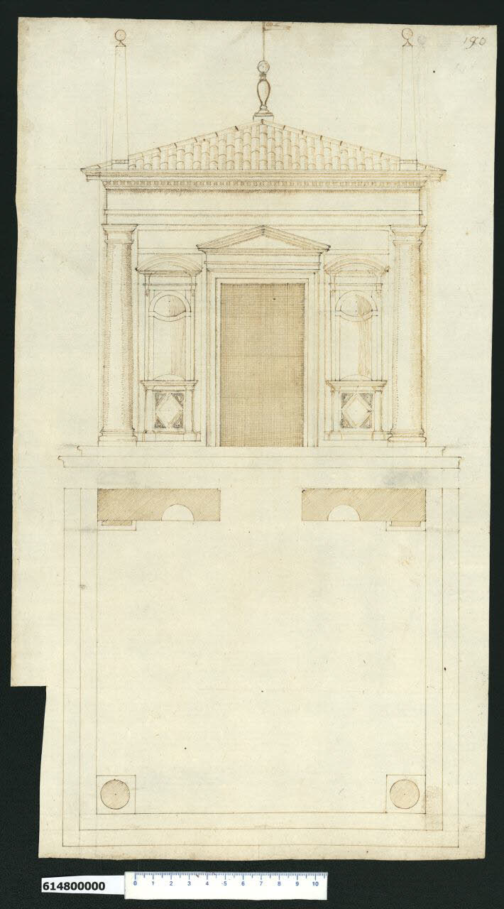 - NOTIZIE STORICO CRITICHE Nell'"Indice de due Tomi d'Intagli Tempietti ed altro", relativo ai tomi V e VI e compilato dal collezionista Giacomo Sardini, il disegno viene iscritto nel paragrafo "Tempietti" con la definizione "190 toscano".\nIl disegno mostra il pronao di un edificio che non è raffigurato, ma del quale si presume l'esistenza dalla presenza di una porta nel prospetto. La struttura posta su un basamento a due gradini, è a pianta quadrata con due colonne doriche che reggono una trabeazione priva di decorazione ad eccezione dei dentelli della cornice. In corrispondenza delle colonne, sulla copertura (a padiglione con tegole) sono posti due obelischi culminanti con una sfera. Il prospetto è tripartito, con porta centrale sormontata da un timpano triangolare, fiancheggiata da nicchie inquadrate da un'edicola con timpano curvilineo e piedistallo ornato da un motivo a losanga; ai lati, in asse con le colonne, sono ubicate due lesene.