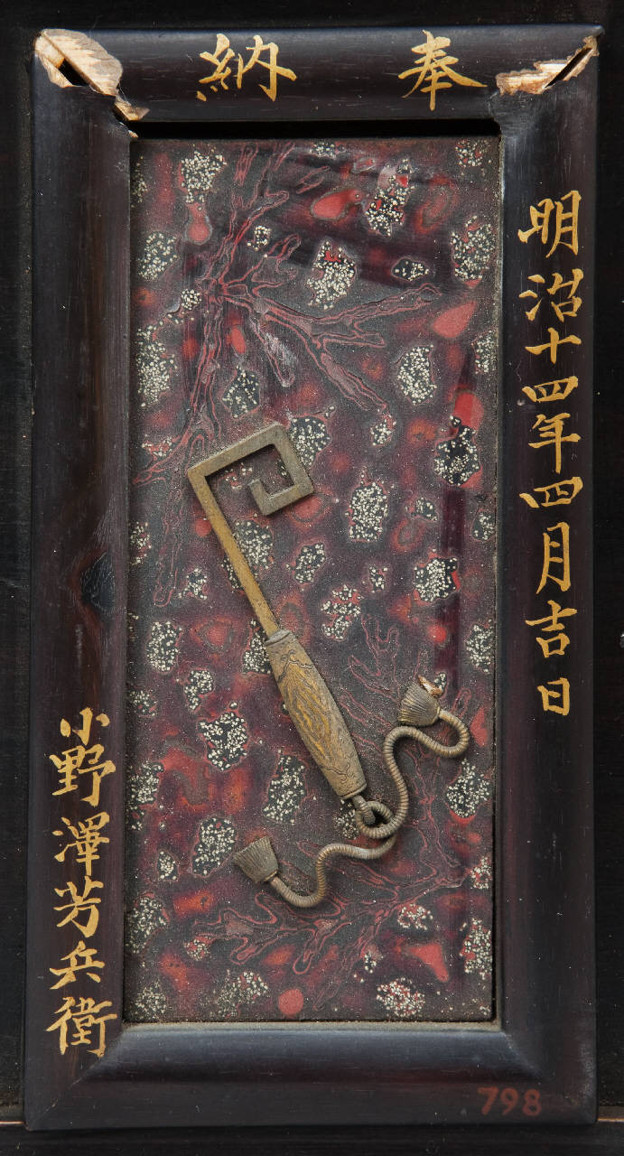 Tavoletta votiva in legno, racchiusa entro cornice. All'interno, su base in lacca con motivo variegato in rosso, bianco e nero, un oggetto liturgico in rilievo. Le iscrizioni, a oro, si vedono sulla cornice.
