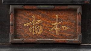 Tavoletta votiva in legno racchiusa entro cornice sulla quale si dispongono applicazioni in metallo. All'interno due ideogrammi in oro con contorni e dettagli incisi.