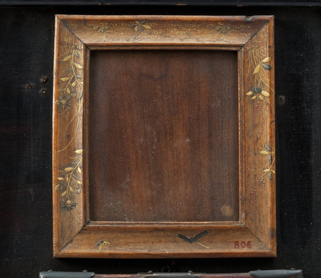 Tavoletta in legno racchiusa entro cornice. Su quest'ultima si dispone una decorazione in oro e argento il leggero rilievo con fiori, libellula e farfalla.