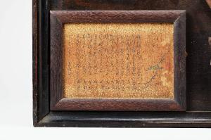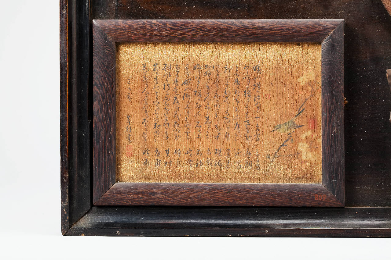 Tavoletta in legno racchiusa entro cornice. All'interno una composizione con un uccellino su ramo a destra e lunga iscrizione a inchiostro nero sulla sinistra.