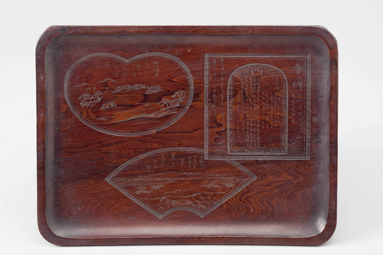 Vassoio rettangolare in legno. Nella parte interna si dispone una decorazione incisa raffigurante tre cartigli, uno a forma di cuore, uno a forma di ventaglio e uno a forma di quadrato. All'interno di ognuna delle tre riserve scorrono lunghe iscrizioni.