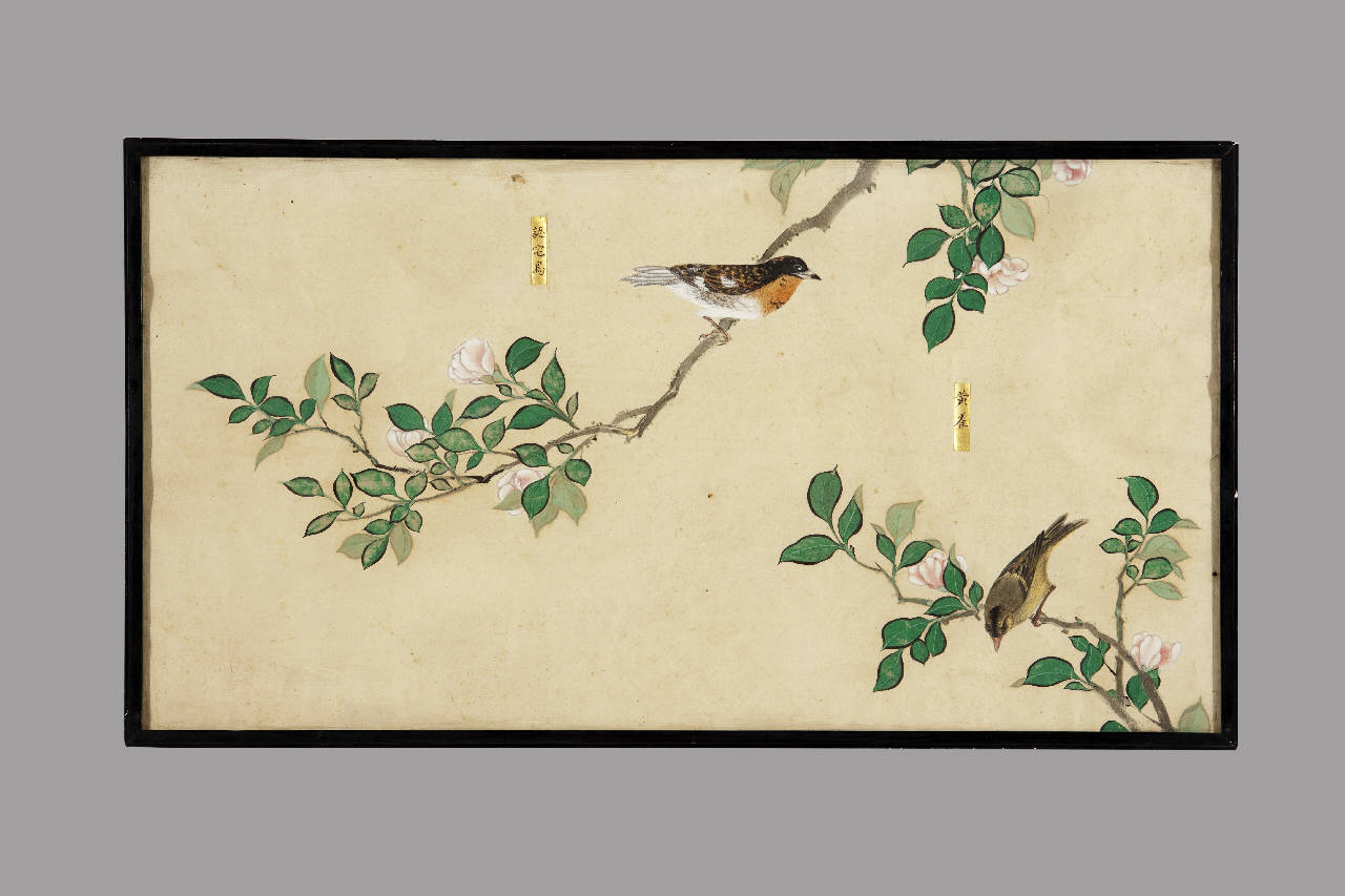 Dipinto a tempera su carta raffigurante due uccelli posati su altrettanti rami fioriti. Nei pressi dei volatili si vedono due cartigli rettangolari dorati con iscrizioni a inchiostro bruno. Cornice in legno e vetro protettivo.