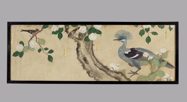 Dipinto a tempera su carta raffigurante due uccelli e un pavone nei pressi di una ramo fiorito. Nei pressi dei volatili si vedono due cartigli rettangolari dorati con iscrizioni a inchiostro bruno. Cornice in legno e vetro protettivo.