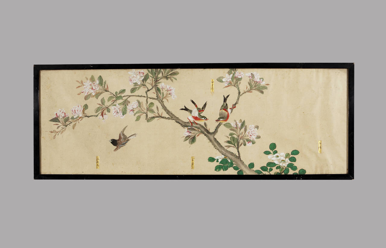 Dipinto a tempera su carta raffigurante tre uccelli, uno dei quali in volo e due posati su un ramo fiorito. Nei pressi dei volatili si vedono quattro cartigli rettangolari dorati con iscrizioni a inchiostro bruno. Cornice in legno e vetro protettivo.