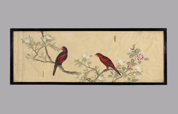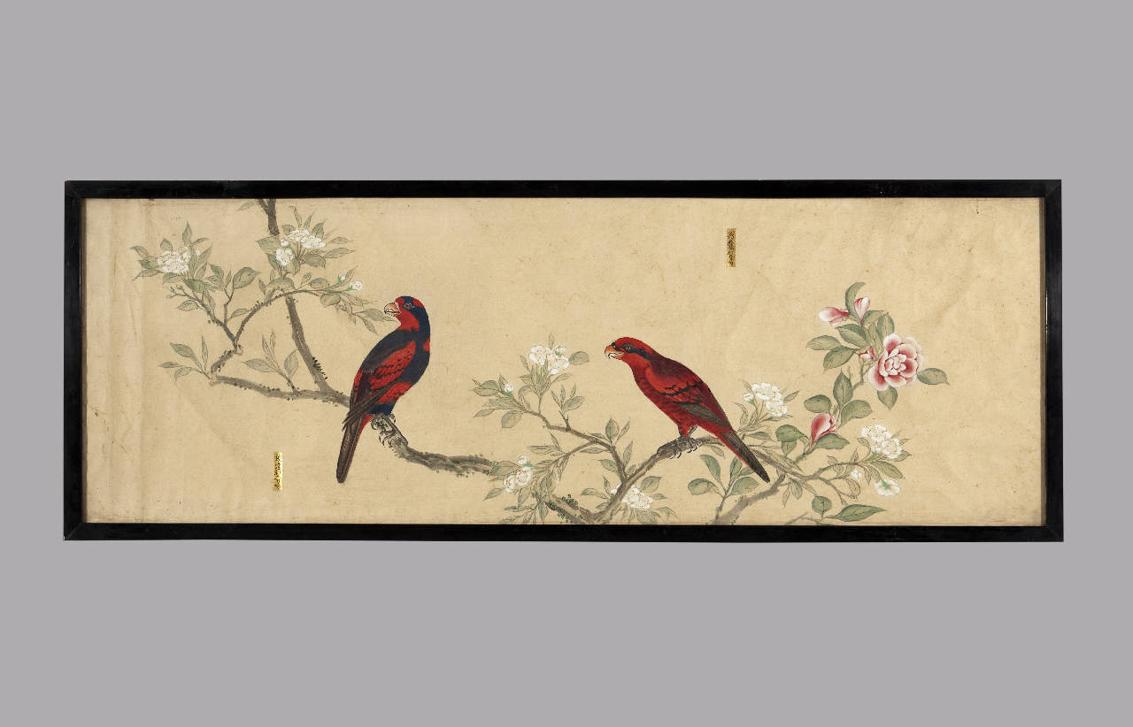 Dipinto a tempera su carta raffigurante due uccelli posati su un ramo fiorito. Nei pressi dei volatili si vedono due cartigli rettangolari dorati con iscrizioni a inchiostro bruno. Cornice in legno e vetro protettivo.