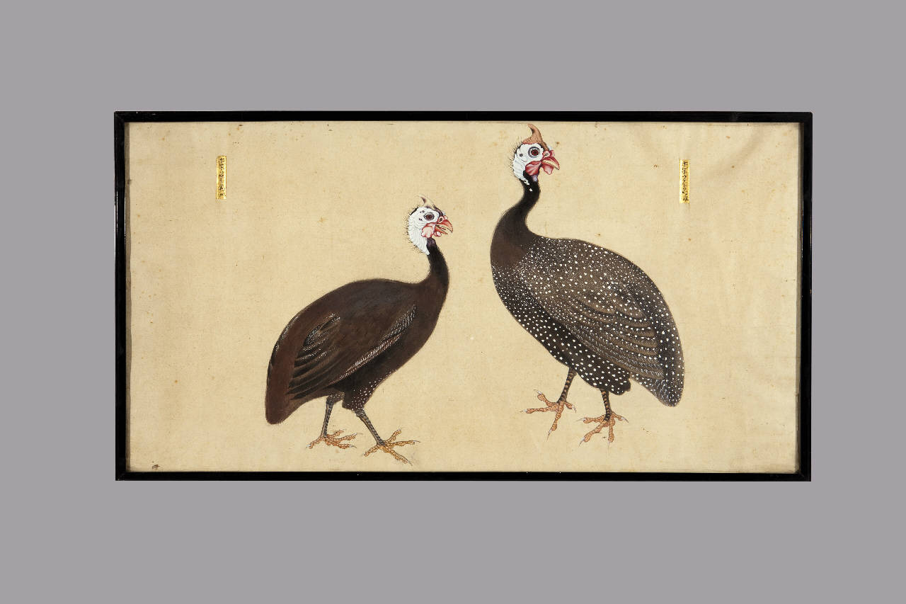 Dipinto a tempera su carta raffigurante due uccelli (forse tacchini). Nei loro pressi due cartigli rettangolari dorati con iscrizioni a inchiostro bruno. Cornice in legno e vetro protettivo.