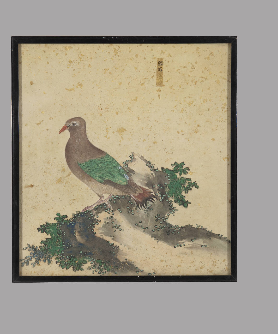 Dipinto a tempera su carta raffigurante un uccello posato su una roccia. In alto a destra cartiglio rettangolare dorato con iscrizioni a inchiostro bruno. Cornice in legno e vetro protettivo.