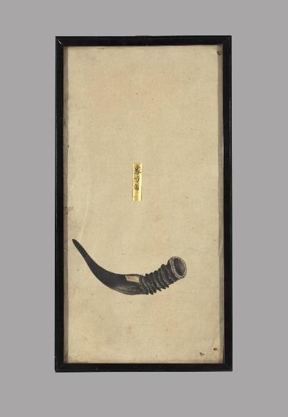 Dipinto a tempera su carta raffigurante un corno di animale. In alto un cartiglio rettangolare dorato con iscrizione a inchiostro bruno. Cornice in legno e vetro protettivo.
