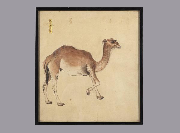 Dipinto a tempera su carta raffigurante un dromedario. In alto a sinistra un cartiglio rettangolare dorato con iscrizione a inchiostro bruno. Cornice in legno e vetro protettivo.