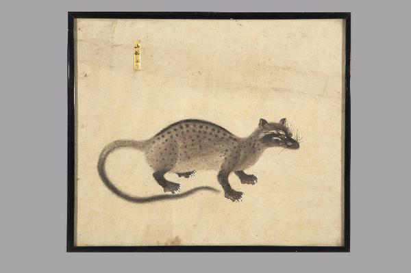 Dipinto a tempera su carta raffigurante un mammifero, forse un gatto selvatico. In alto a sinistra un cartiglio rettangolare dorato con iscrizione a inchiostro bruno. Cornice in legno e vetro protettivo.