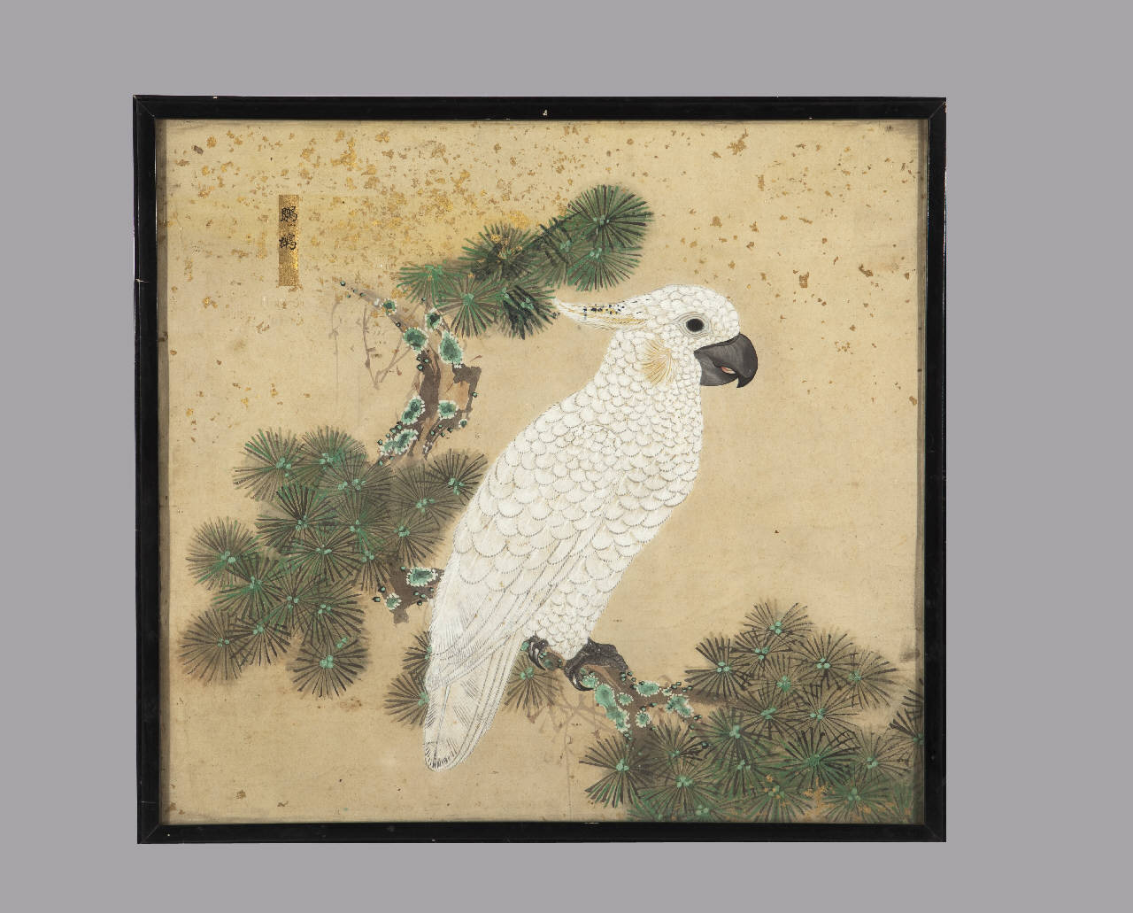 Dipinto a tempera su carta raffigurante un uccello posato su un ramo. In alto a sinistra cartiglio rettangolare dorato con iscrizioni a inchiostro bruno. Cornice in legno e vetro protettivo.