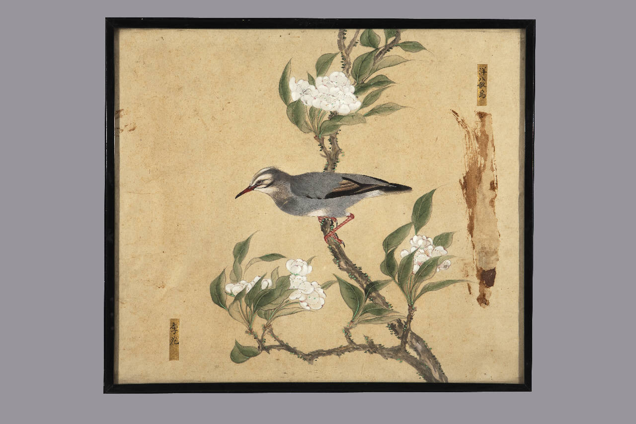 Dipinto a tempera su carta raffigurante un uccello posato su un ramo fiorito. In basso a sinistra cartiglio rettangolare dorato con iscrizioni a inchiostro bruno. Cornice in legno e vetro protettivo.
