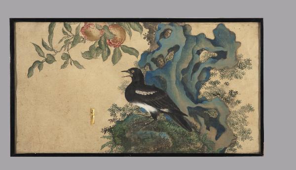 Dipinto a tempera su carta raffigurante un uccello posato su una roccia con un ramo fiorito. In basso verso a sinistra cartiglio rettangolare dorato con iscrizioni a inchiostro bruno. Cornice in legno e vetro protettivo.