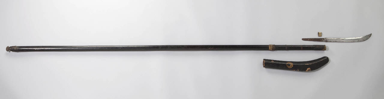 Falcione (naginata) con asta in legno laccato di nero omogeneo (roironuri). Sul fodero stemma con glicine (fuji) stilizzato a oro, ripetuto più volte. Accessori in metallo.