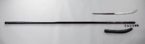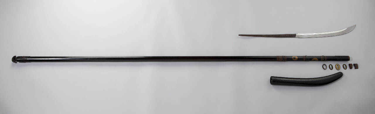 Falcione (naginata) con asta ovale in legno laccato di nero omogeneo (roironuri) decorata a oro con due stemmi (mon) a forma di glicine (fuji) stilizzato. Accessori in metallo.