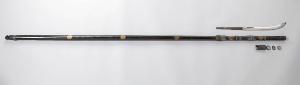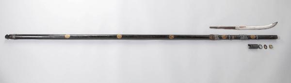 Falcione (naginata) con asta in legno laccato di nero omogeneo (roironuri) decorata a oro con stemmi (mon) a forma di susino entro un cerchio. Lo stesso stemma compare anche sul fodero (saya). Rondelle di spessore (seppa) con bordo zigrinato, ricoperte di lamina d'argento. Lama breve con sgusci (hi) rossi.