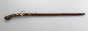 Fucile con canna ottagonale in metallo, calcio in legno con inserzioni di garza all'interno, meccanismi e ornati superficiali in metallo dorato e inciso. Le decorazioni sono soprattutto floreali, alle quali si aggiunge una placca raffigurante il volto di un samurai con elmo.