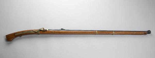 Fucile con canna ottagonale in metallo verniciato, calcio in legno, meccanismi e ornati superficiali in metallo dorato e inciso. Sulla canna si ripete uno stemma (mon), raffigurante fiore a tre petali entro cerchio, in argento.