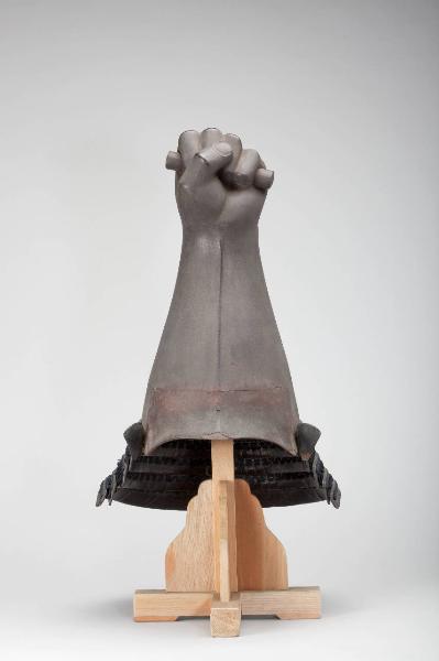 Elmo straordinario (kawari kabuto) in ferro, in parte laccato, a forma di pugno che regge un cilindretto. Le lamelle del paracollo sono tenute insieme da cordoncino in seta blu.