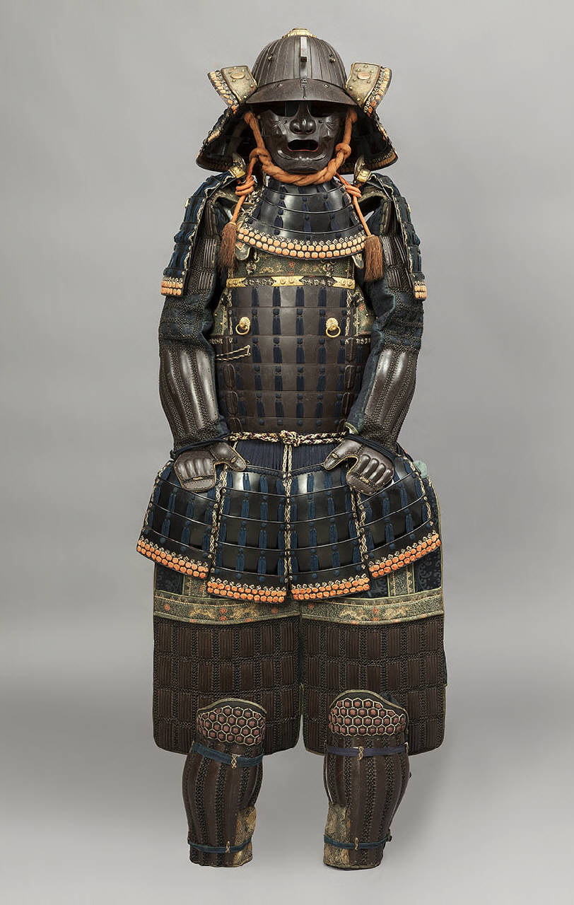 Armatura completa (tosei gusoku, letteralmente "armatura di oggi", diffusa dopo il periodo Muromachi) di tipo mogamido (con corazza a lame). Nastro blu scuro e inserti in tessuto lavorato a fili d'oro. La maschera (menpo), di tipo hoo-ate (che copre mezza faccia), è in ferro, sbalzato e laccato di rosso all'interno. Elmo (kabuto) di tipo suji, con coppo (hachi) formato da 34 lamelle e listelli. Sul proteggicollo e sulle alette proteggi tempie (fukikaeshi) stemmi (kamon) floreali in ottone inciso, forse della famiglia Matsui.
