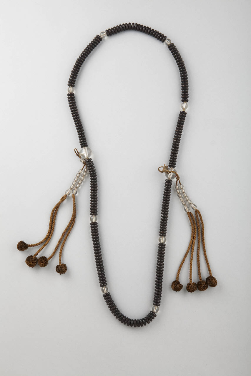 Rosario buddhista a forma di collana con dischetti di osso dipinti in nero intervallati da sfere in cristallo. Cordoncini in seta marrone terminanti con fiocchetti.
